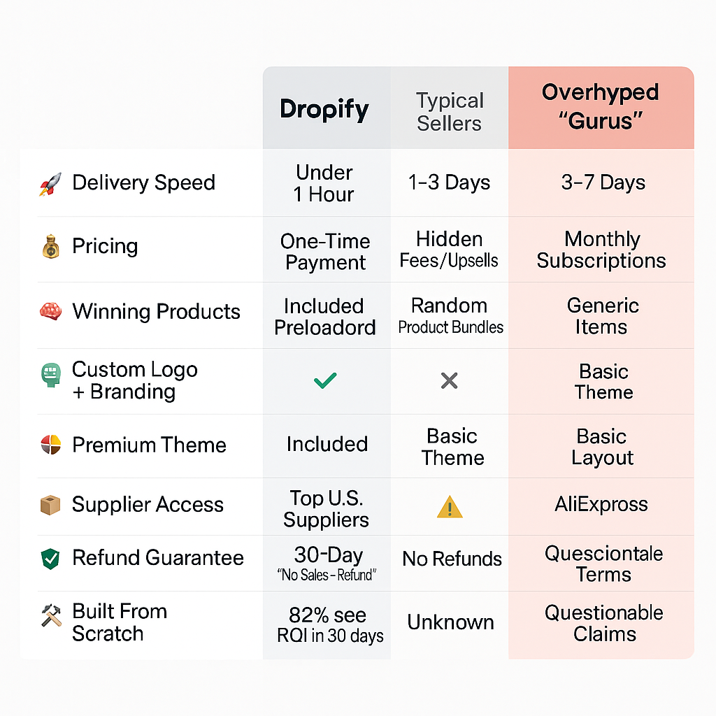 Dropify delivers a professionally designed, fully functional Shopify store — complete with a custom logo, premium theme, winning products, and top-tier supplier access. No tech skills needed. No setup required. Just plug in and start selling.